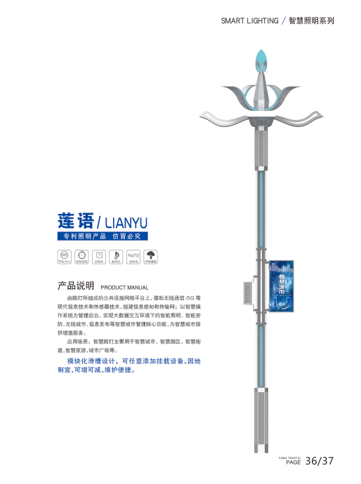 具有根據(jù)車流量、時(shí)間、天氣情況等條件設(shè)定方案自動(dòng)調(diào)節(jié)亮度、遠(yuǎn)程照明控制、故障主動(dòng)報(bào)警、燈具線纜防盜、遠(yuǎn)程抄表等功能;智慧路燈可以有效控制能源消耗,大幅節(jié)省電力資源,提升公共照明管理水平,降低維護(hù)和管理成本并利用計(jì)算等信息處理技術(shù)對(duì)海量感知信息進(jìn)行處理和分析,對(duì)包括民生、環(huán)境、公共安全等在內(nèi)的各種需求做出智慧化響應(yīng)和智能化決策支持,使得城市道路照明達(dá)到“智慧”狀態(tài)。