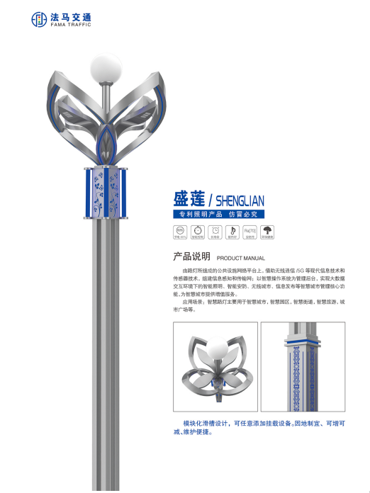 4、專業(yè)設(shè)計(jì)人員、豐富的設(shè)計(jì)經(jīng)驗(yàn)。法馬智慧多功能桿風(fēng)格多樣,造型美觀大氣,目前擁有雙子星款、滑翔款、玉堂春款、墨樓款、重邁款、諜影款、桃花源款等多種款式,且擁有外觀專利。