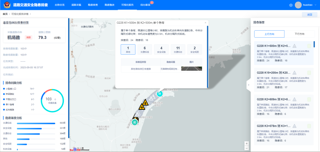 依照國家行業(yè)相關(guān)標準規(guī)范,建立標準化、精準化的排查流程及方法,對道路隱患依次排查。通過可視化、數(shù)據(jù)看板等手段再現(xiàn)道路隱患點位的既往數(shù)據(jù)、現(xiàn)在實際情況以及整改后的效果。